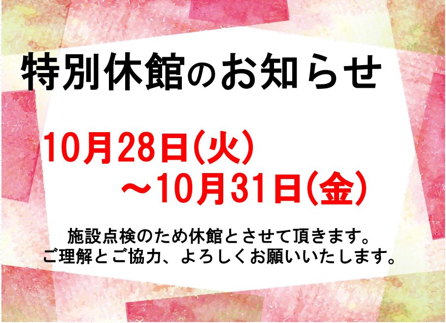 【安全点検日】2025年10月28日~10月31日は休館日になります